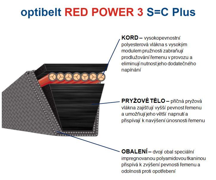 Konstrukce řemenu a jeho vlastnosti přispívají k efektivnějšímu a ekonomičtějšímu provozu strojního zařízení. V porovnání s konvenčními typy klínových řemenů dosahují řemeny RED POWER navýšení únosnosti až o 50 %, takže jejich použití představuje výrazné zeštíhlení celého pohonu a snížení zatížení v uložení hřídelí.