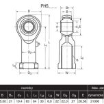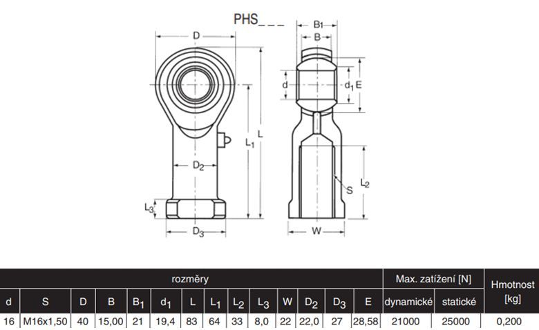Kloubové oko PHS 16B je standardní typ oka s otvorem 16 mm, s vniřtřním závitem M16x1,5. Má kluzné uložení ocel / bronz. Dodává se včetně maznice.