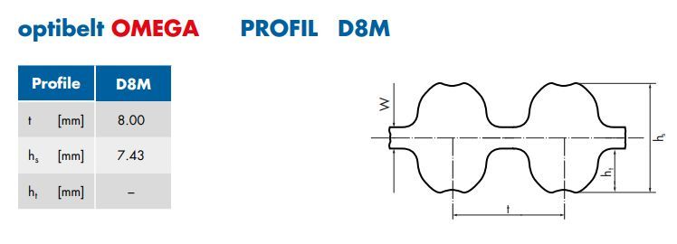 Ozubený řemen 20 D8M 1760 optibelt Omega D patří k výkonným, vysoce přesným oboustranně ozubeným řemenům, určeným pro kompaktní pohony se změnou smyslu otáčení řemenic. Řemen je vyroben z chloropropylenové pryžové směsi, tažné kordy tvoří stáčená skelná vlákna. Může pracovat i při poměrně vysokých rychlostech a opásávat i řemenice malých průměrů.