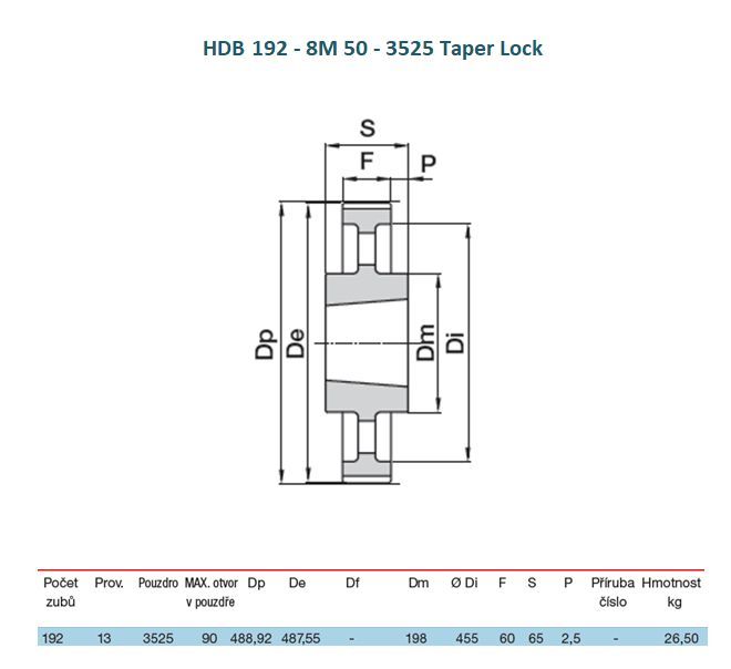 Ozubená řemenice HDB 192 - 8M 50 je litinová řemenice se 192 zuby v provedení na kuželové upínací pouzdro Taper Lock, pro řemeny profilu HTD 8M či RPP 8 o šířce 50 mm.