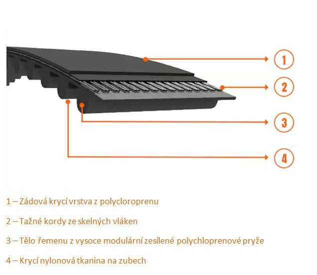 Tvoří jej neoprenová směs, tažný kord ze skelných vláken a otěruvzdorný nylonový povlak na zubech.