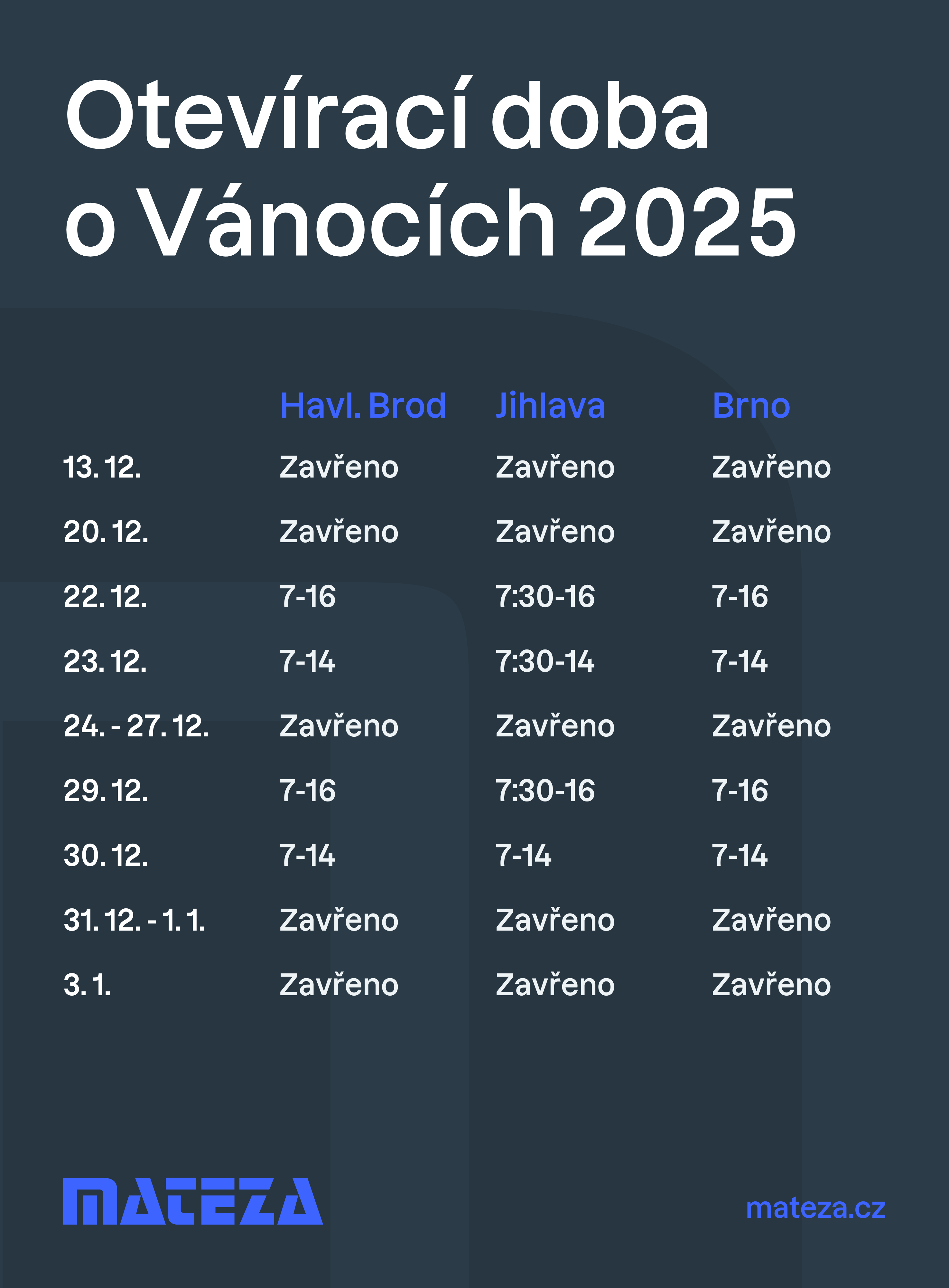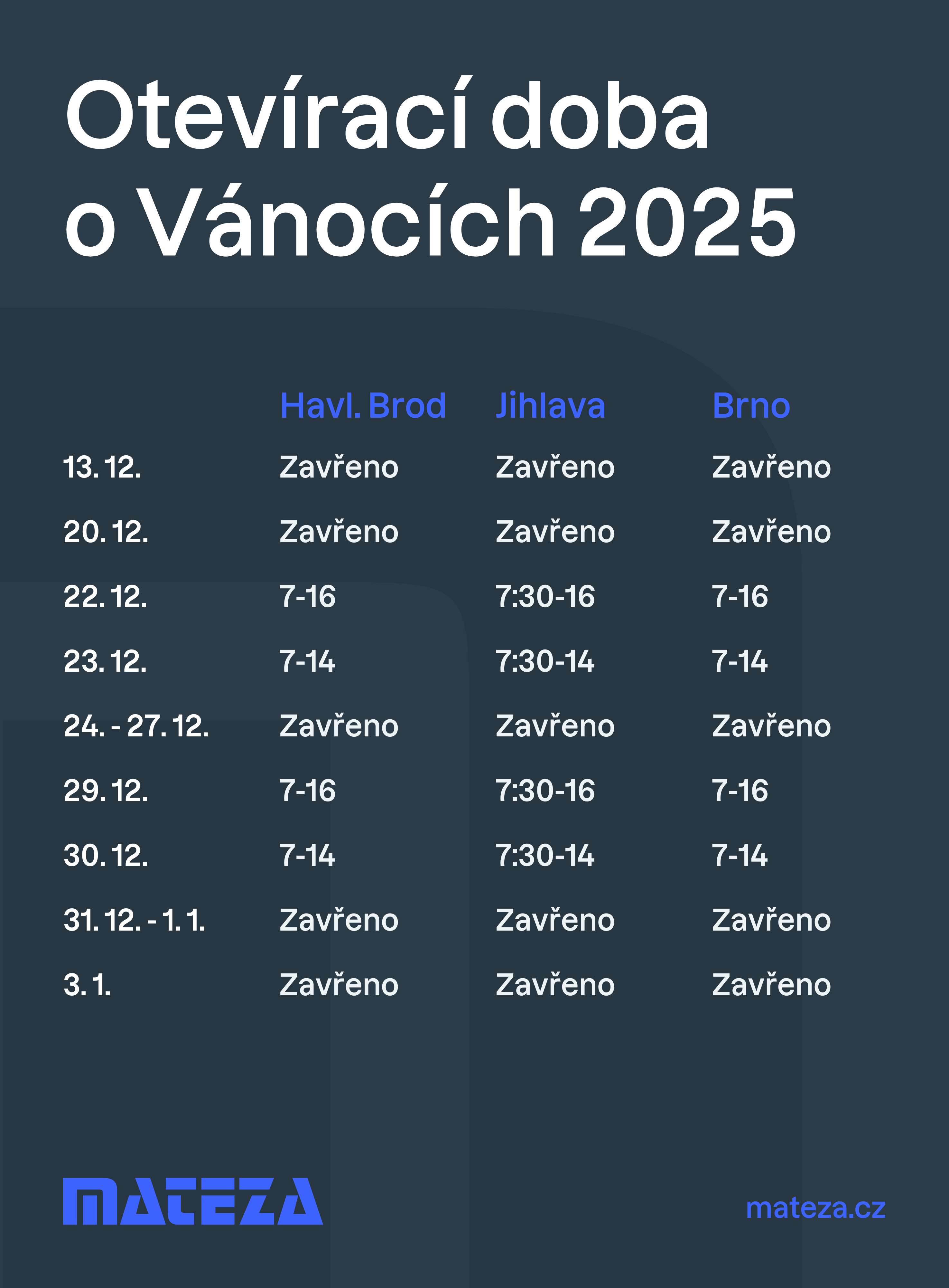 Během období od 13. 12. 2024 do 3. 1. 2025 fungují naše pobočky v upraveném režimu. Některé mají zkrácenou otevírací dobu, jiné jsou v určitých dnech uzavřené. Připravili jsme proto přehled, kde najdete veškeré informace na jednom místě, jasně a přehledně.