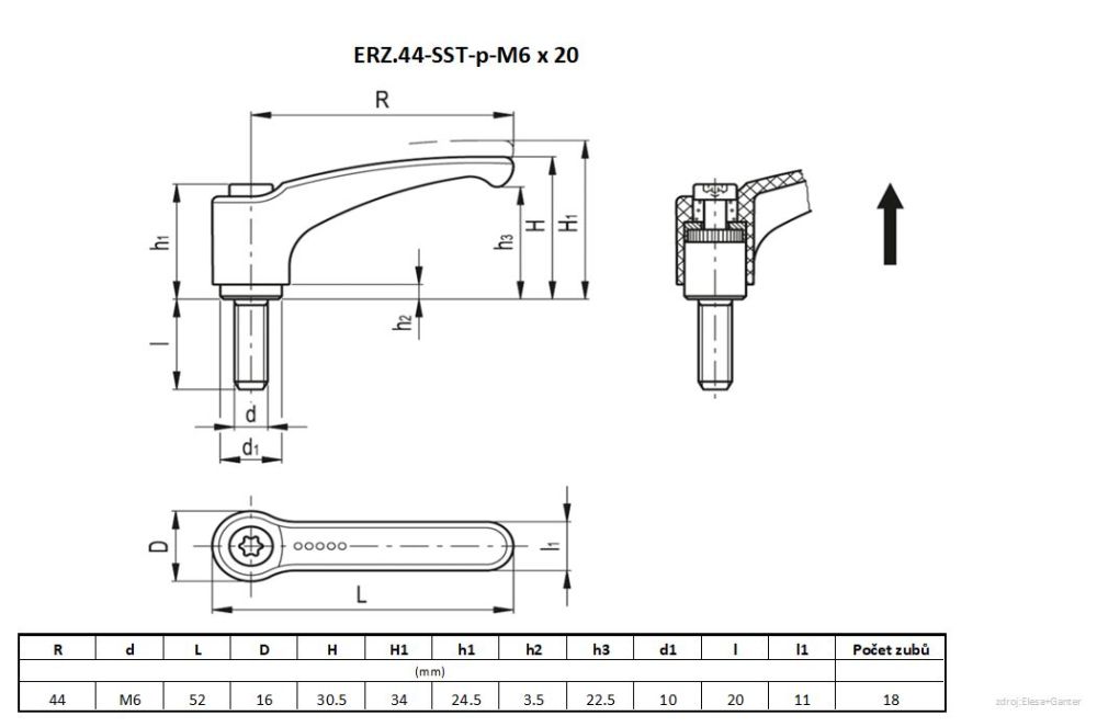 Regulovatelná upínací páka ELESA+GANTER ERZ.44-SST-p-M6x20 - černá