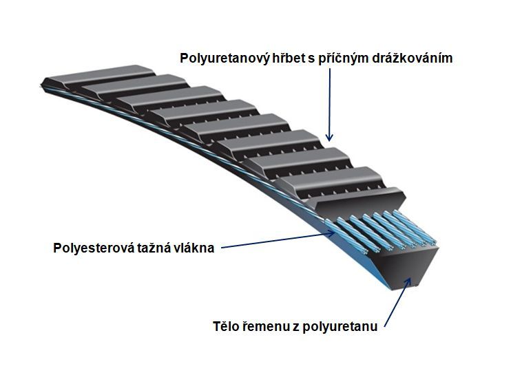 Řemen je určen pro přenos výkonu při vysokých otáčkách s plynulým a tichým chodem a při velmi nízkých vibracích. Je vyroben z vysoce odolného polyuretanu a speciálního tažného vlákna. Řemen má příčně žebrovaný vnější hřbet pro zvýšení ohybové pružnosti.