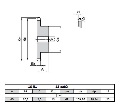 Řetězové kolo 16 B1 - 12 zubů VF kalené - s nábojem