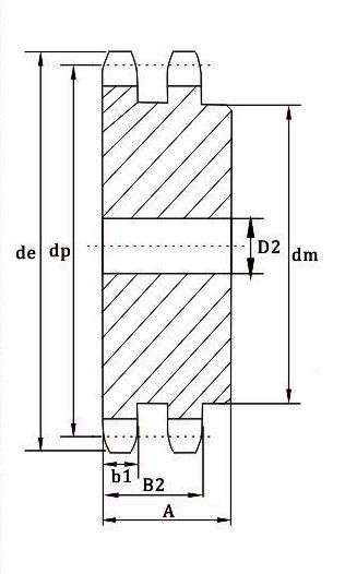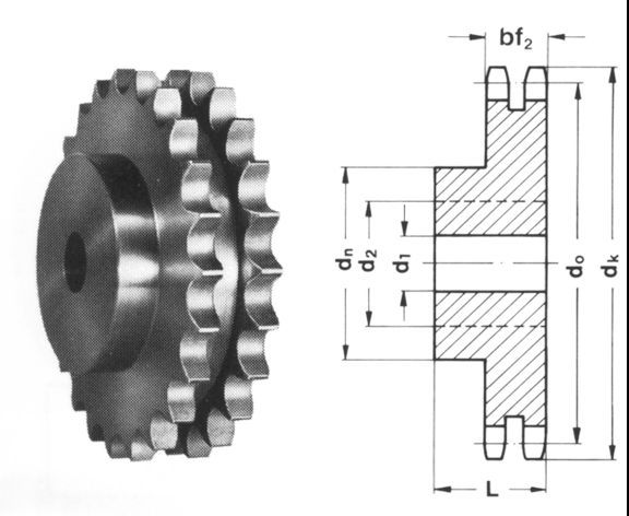 Ocelové řetězové kolo pro dvouřadý válečkový řetěz profilu 20B podle normy DIN 8187.