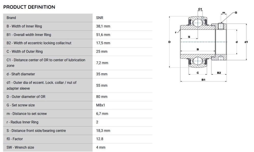 EX307G2 je vkládací typ jednořadého kuličkového ložiska pro montáž na hřídel průměru 35 mm. Ložisko má zaoblený vnější povrch a oboustranné těsnění. Pro snadnou a rychlou montáž na hřídel slouží excentrický upínací kroužek.