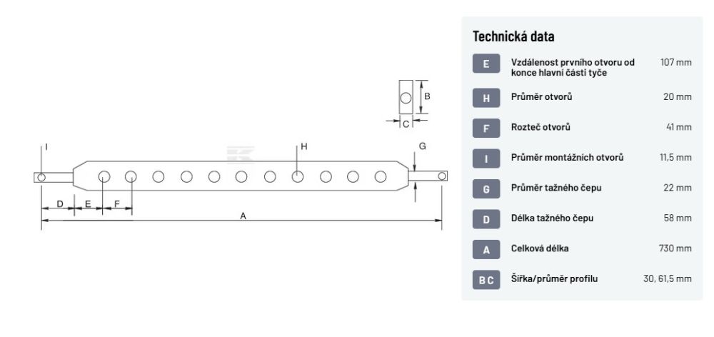 Tažná lišta kat. 1 - 30 x 61,5 x 730 mm (otvory 20 mm, tažný čep 22 x 58)