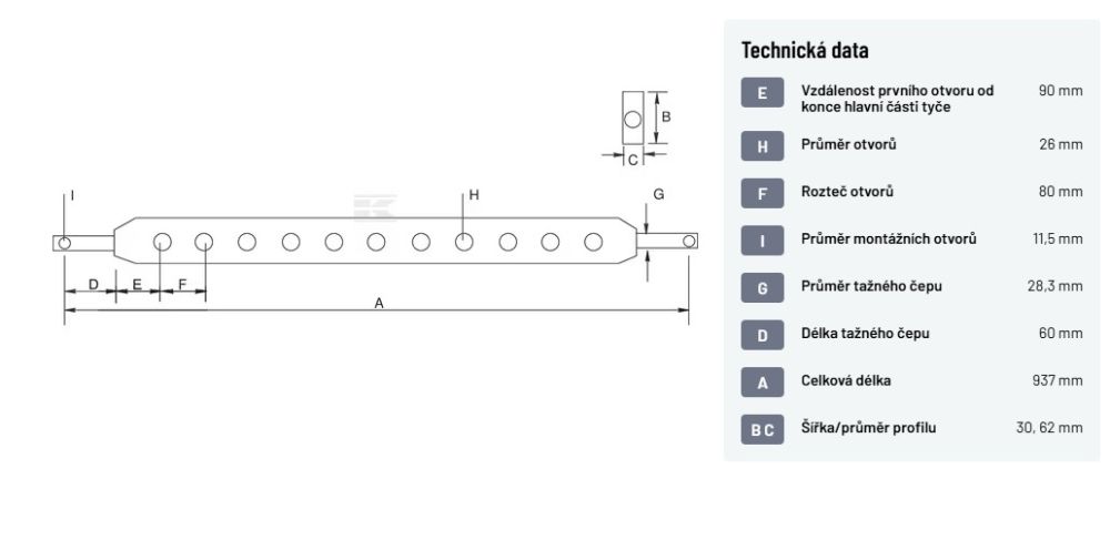 Tažná lišta kat. 2 - 30 x 62 x 937 mm (otvory 26 mm, tažný čep O28,3 x 60)