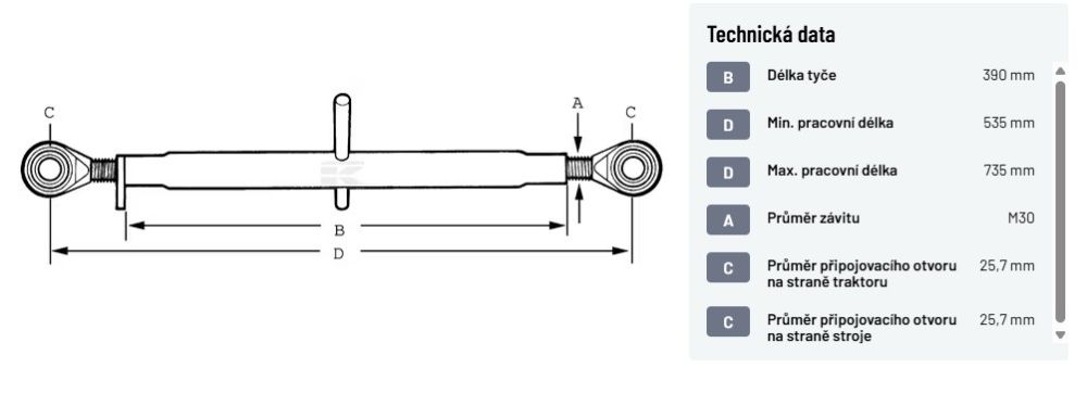 Třetí bod oko-oko kat. 2/2, délka 390 mm, M30, připojení 25,7 mm