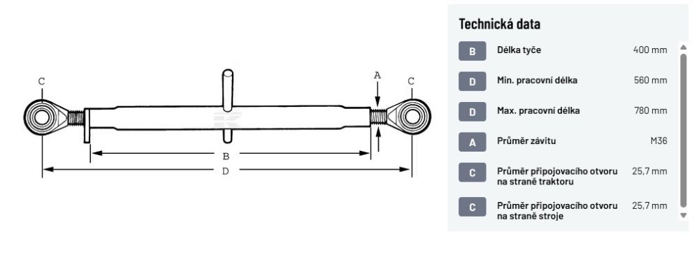 Třetí bod oko-oko kat. 2/2, délka 400 mm, M36, připojení 25,7 mm