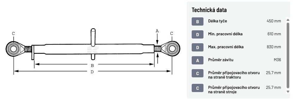 Třetí bod oko-oko kat. 2/2, délka 450 mm, M36, připojení 25,7 mm