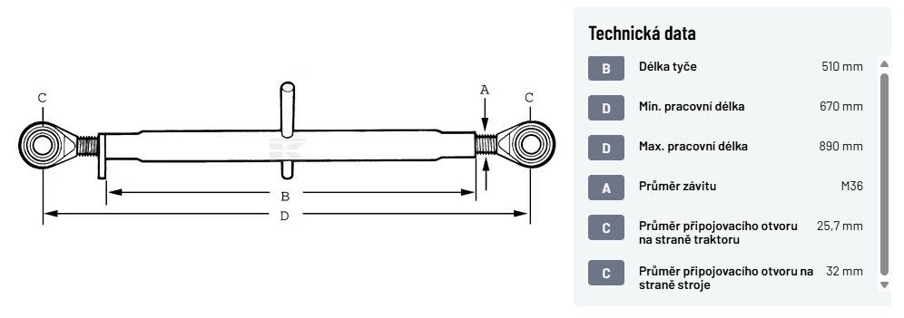 Třetí bod oko-oko kat. 2/3, délka 510 mm, M36, připojení 25,7/ 32 mm