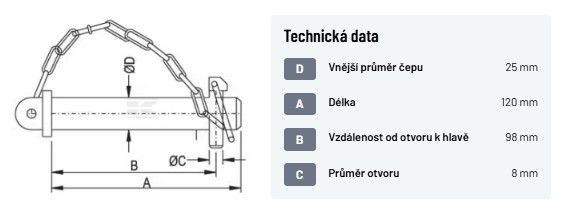 Zajišťovací čep 3. bodu s kolíkem O25 x 132/120 (otvor 8 mm)